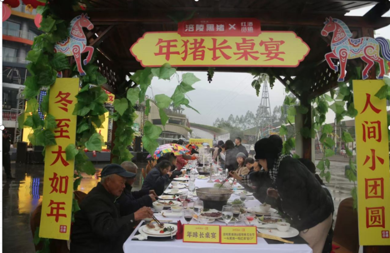 红酒小镇景区红酒广场,数十米长桌宴尤为醒目。餐桌中央,多口火锅汤底翻滚、热气腾腾、香气四溢,涪陵黑猪制成的各式菜品成为宴席主角,“红酒配猪排,火锅煮黑猪”的中西融合吃法,让游客眼前一亮。